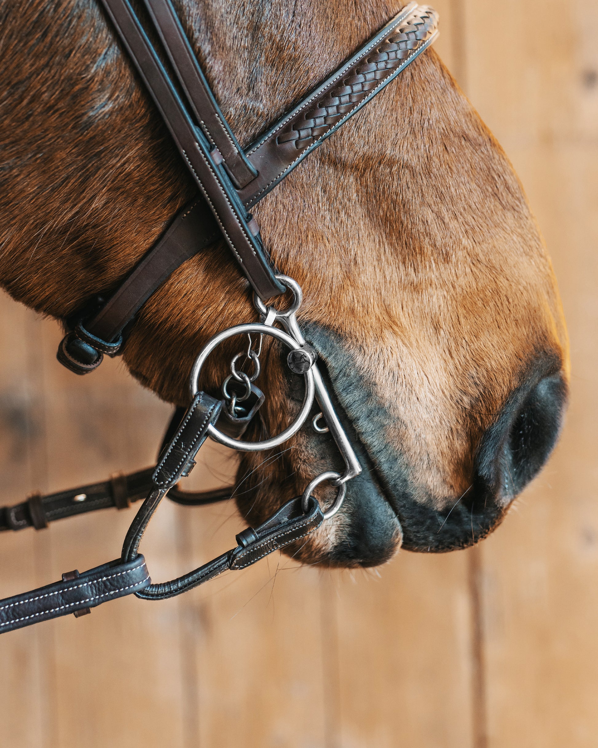 With Fager adjustable delta straps,  you can adjust the strength without having to use two reins. By shortening the strap that goes to the lower ring you get more leverage and by shortening the strap to the upper part of the Pelham,  you will get less leverage.